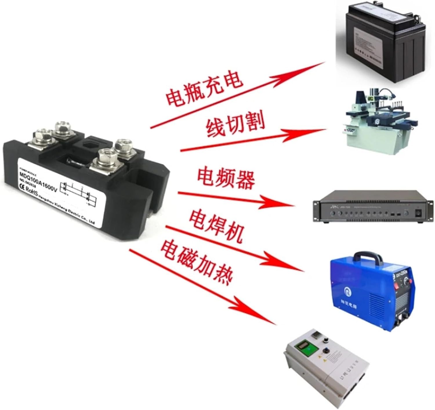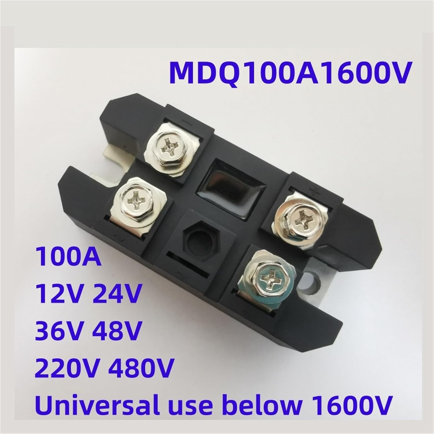 DiodesMDQ100A1600V single-phase rectifier bridge 12V 24V 36V 48V 220V 480V AC-DC module 100Amp 1600Vreminder1. About product selectionThe marked current of the power module is the average value of the on state, not the actual effective value of long-term operation. When selecting, sufficient margin should be left based on the actual working environment and conditions.(1) Pure resistive load 2-2.5 times margin: actual current (A) × 2 (~2.5)=Module nominal current (A) (2) Inductive load 6-7 Signal margin: Actual current (A) × 6 (~7)=Module nominal current (A)2. Radiator configurationWhen the actual working current of the device is greater than 5A, please be sure to configure a suitable heat sink for use==========Hign-concerned Chemical : None