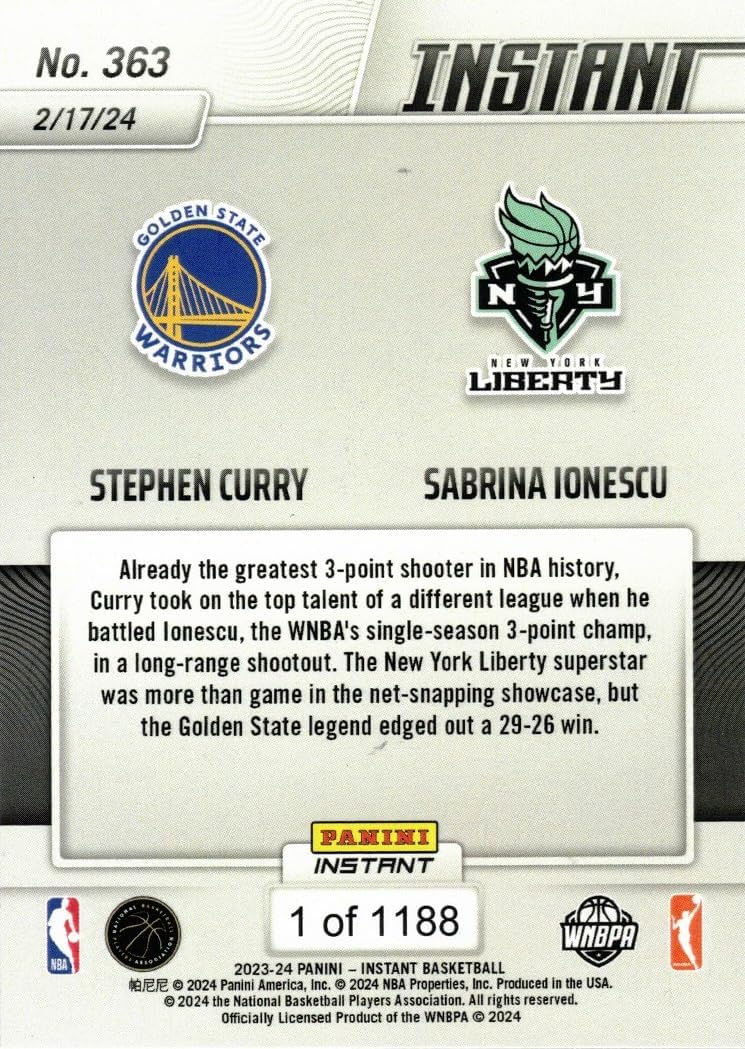 2023-24 Panini Instant #363 Stephen Curry / Sabrina Ionescu Basketball Card - Curry Challenges Ionescu in History Shootout on February 17, 2024. This is an original, authentic Stephen Curry/Sabrina Ionescu basketball card produced by Panini during the 2023-24 NBA season. In addition, this card is numbered on the back '1 of 1188', meaning only 1,188 of these cards were produced. Please note: All 1,188 of these cards have '1 of 1188' on the back, so this card isn't necessarily the first one that was made. Still a limited and special card. Card is in Near Mint condition and therefore may have small flaws(s). Stock photo shown.