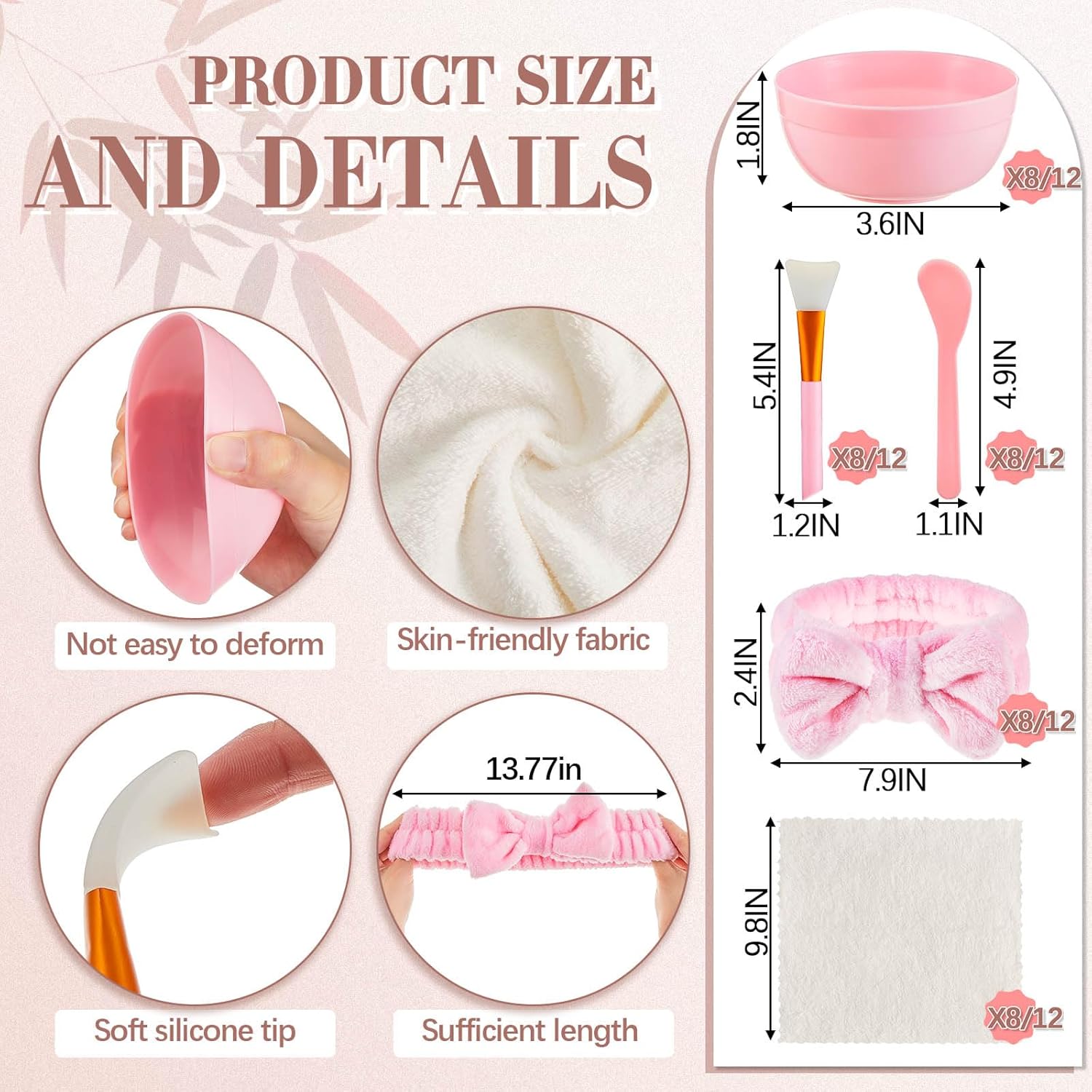 | Included Components | 12 x Headbands, 12 x Makeup bags, 12 x Mirror and 12 x Facial Mask Bowl Set, 12 x Scrunchie, 12 x Square towels |