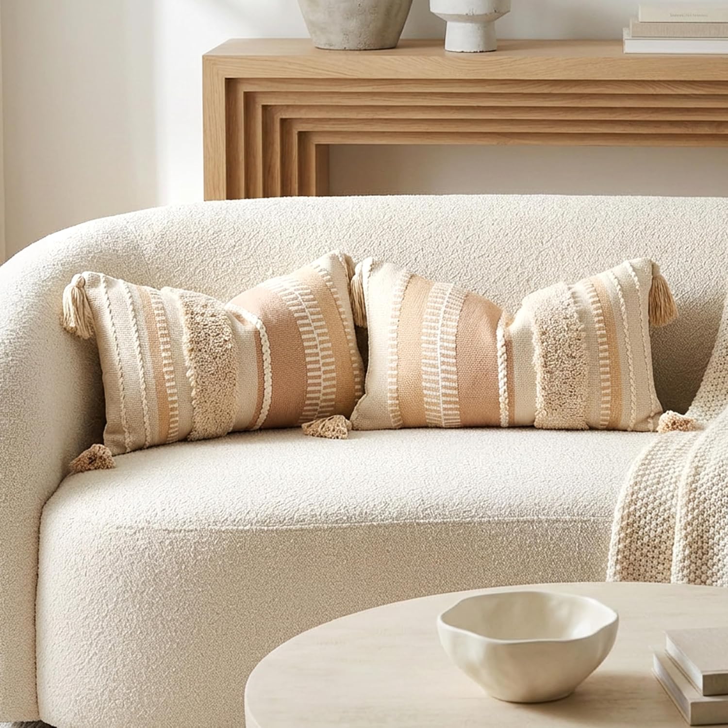 BLISSBLUSH Decorative Throw Pillow Cover 20x20 Combo Set of 2 Square Cream Neutral White Boho Accent Pillowcase Tassels Farmhouse Cushion for Couch Sofa Bedroom Living Room Home Décor COVER ONLY