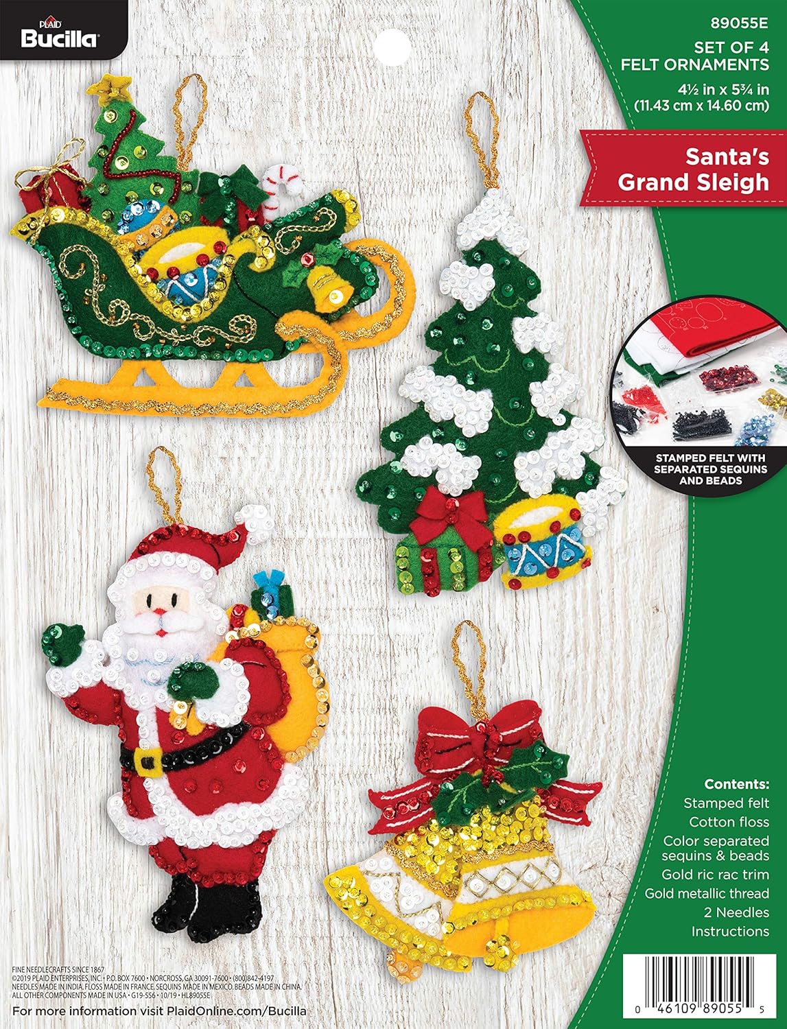 Your holiday won’t be complete without Santa’s Grand Sleigh Stocking from Bucilla. Festive designs, quality materials, and generous embellishments continue to make Bucilla felt kits a favorite stitchery tradition. This package contains stamped felt, cotton floss, color-separated sequins and beads, gold ric rac trim, gold braided trim, gold metallic thread, two needles, and instructions. 86842E -Design: Santa’s Grand Sleigh. Finished dimensions: 18 inches long. Made in USA.