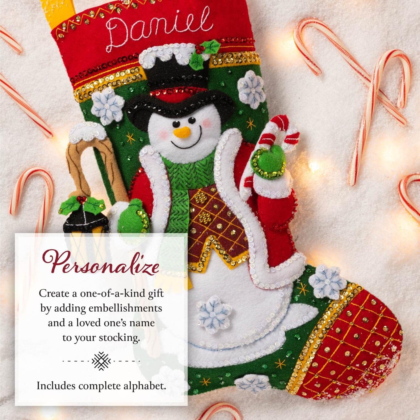 Celebrate the holidays with the Bucilla Light Up the Holidays Felt Stocking Kit. This classic stocking features a snowman with a lantern walking through the snow. This embroidery kit includes the basic materials needed to create an 18” stocking including stamped felt, cotton embroidery floss, separated sequins and beads, embroidery needles, and instructions. Whether you have been stitching for years or you are looking to learn a new skill, Bucilla provides the products and education for every interest and skill level. Add a festive touch to your holiday traditions with the Bucilla Light Up the Holidays Felt Stocking Kit.