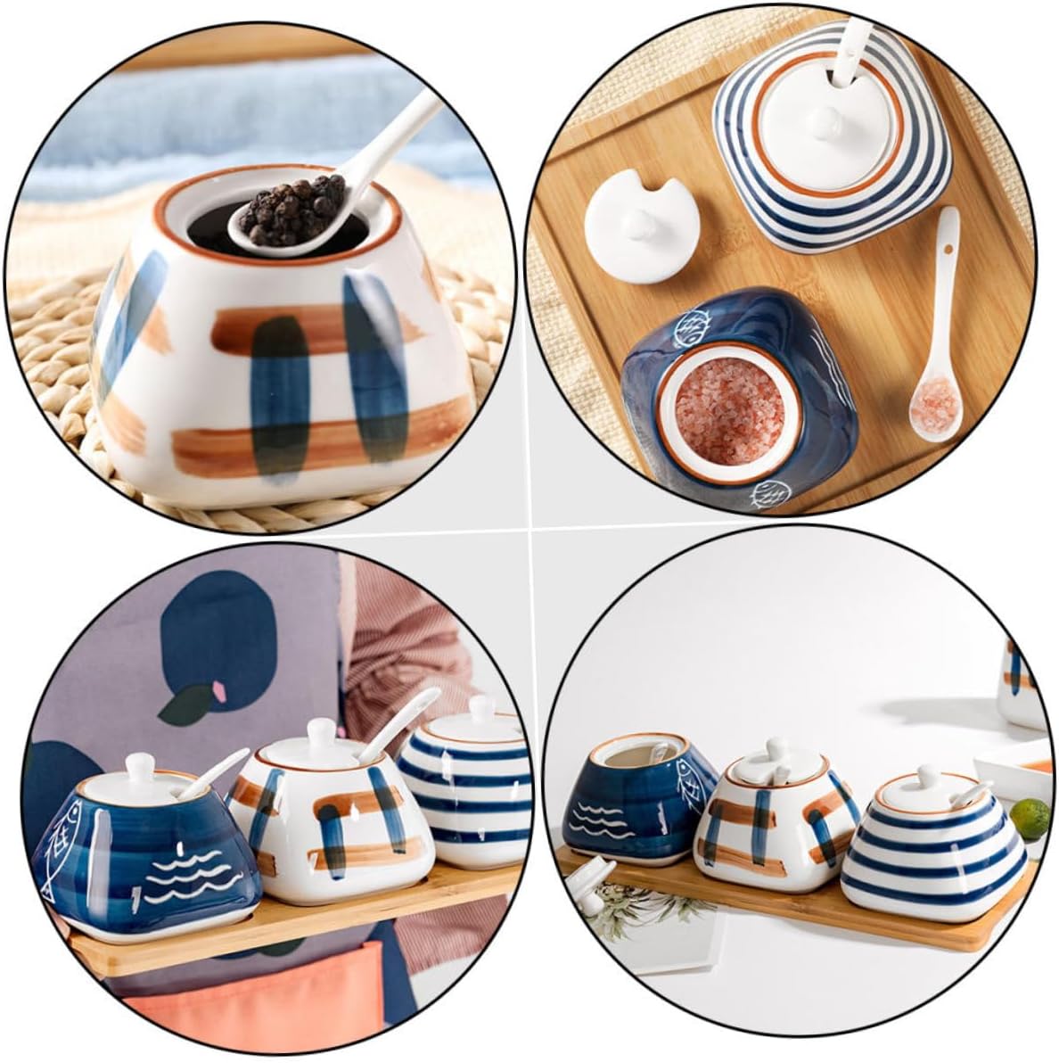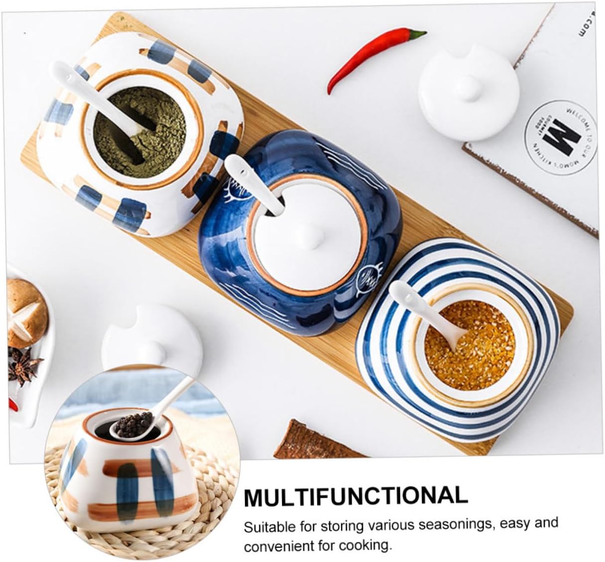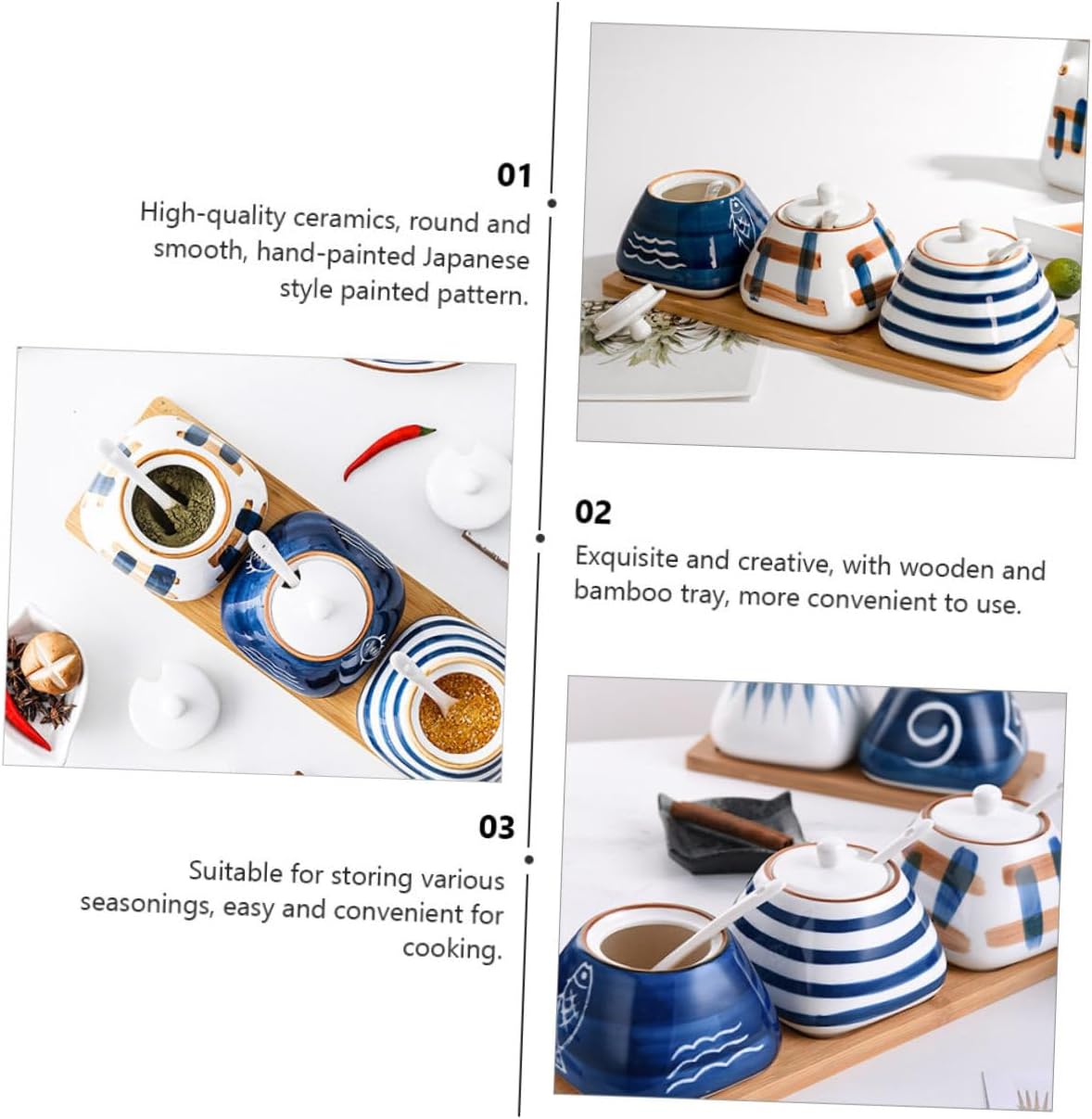 Package Include 3 x Ceramic Seasoning Containers 1 x tray Features - Size: About 9.50X8.50X5.50cm/3.73X3.34X2.16inch Kitchen Seasoning Bottles. - Material: Ceramic, Wood Multi-function Spice Jar. - Color: Assorted Color Kitchen Supply. - Simple look design can match your kitchen decoration very well, and chic Kitchen Seasoning Jar. - Widely using range, suit for household kitchen, restaurant, dining room and some other places Spice Container. - Made of , it is and in use Salt Jar. - Can be given to your close friends or relatives as a present, compact and Seasoning Jar. - Fine craftsmanship, texture, , and sturdy Spice Jar.Goods DescriptionSpice Container Are you looking for a professional, yet seasoning storage box? Are you in search of a sturdy, trustworthy seasoning storage box for your kitchen? , ! Our professional seasoning storage box must meet your need.Condiment Jar It is for you