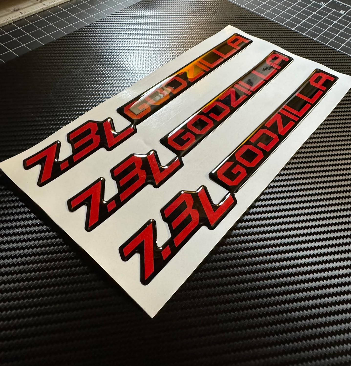 This listing is for a set of (3) Gel-coated (domed) 7.3L GODZILLA emblems for your Ford Super Duty. One for each door and one for the tailgate…or glove box….or tool box?? 🤷♂️ $AVE by purchasing this (3) pack, and also get a free interior overlay (a $6 value)! Color: Red on Black background Size of each emblem is 1.279in x 9.5in You asked for em’- you got em’! Made from the same, highest quality cast “wrap” vinyl (3M Controltac) that we use for our emblem overlays. Repositionable and bubble free. Detailed install instructions included! These are premasked with clear transfer tape and we’ve even provided a horizontal reference line for you to measure to, which will allow you to install the emblem parallel to the body line. These are not your typical flat vinyl “stickers”! These are coated with crystal clear polyurethane for a unique 3D look. The coating will also make them incredibly durable! When someone asks me “well how long will they last?”, I say- FOREVER!! 😎