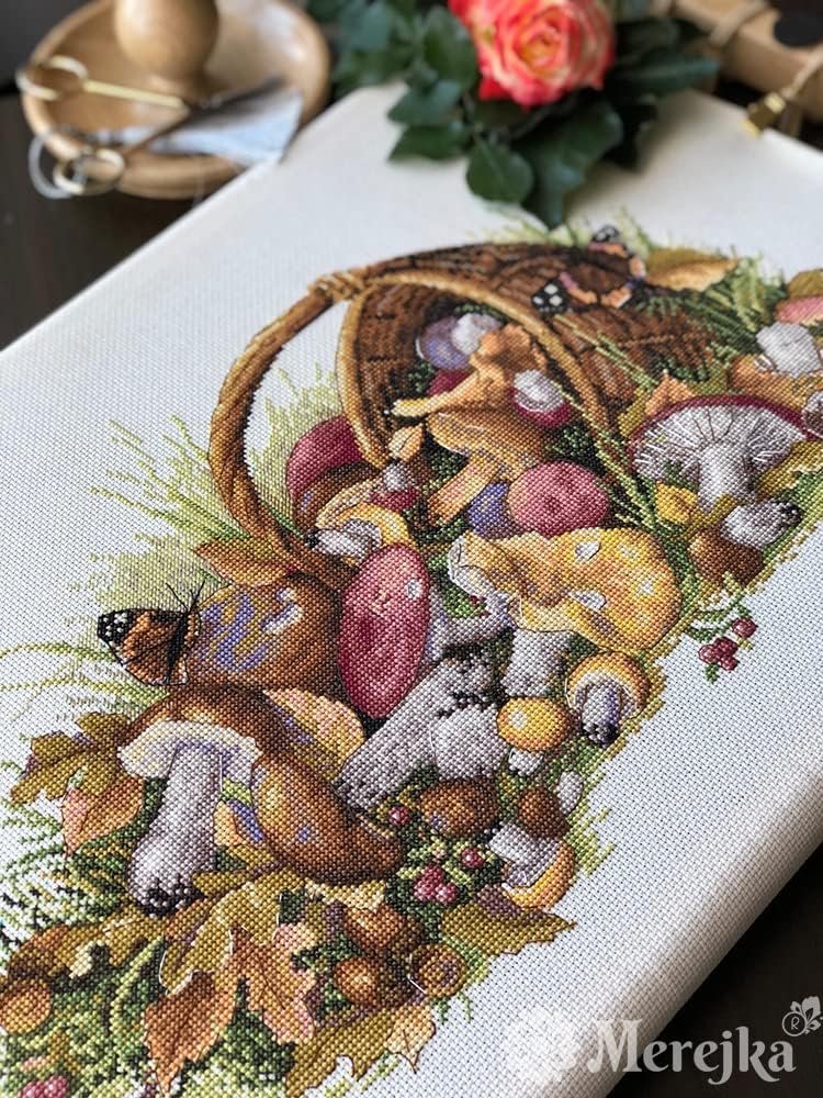 Counted cross stitch kit. It contains Aida 16, ecru color canvas and DMC threads and coloured schema pattern. The stitched size in cm: 40x23. The number of colours 27.