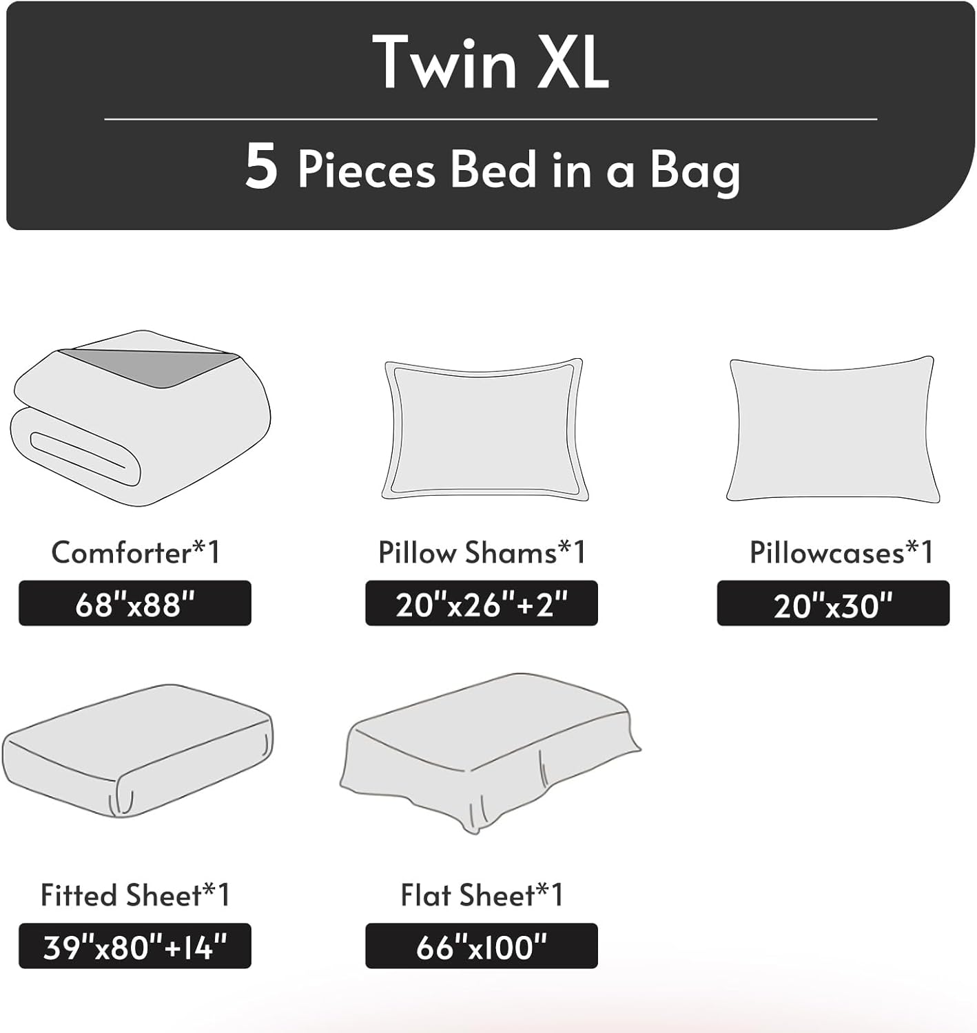 | Included Components | 1 comforter (88" x 88"), 2 pillowcases (20" x 30"), 2 pillow shams (20" x 26" + 2"), 1 fitted sheet (60" x 80" + 14"), and 1 flat sheet (90" x 102") |