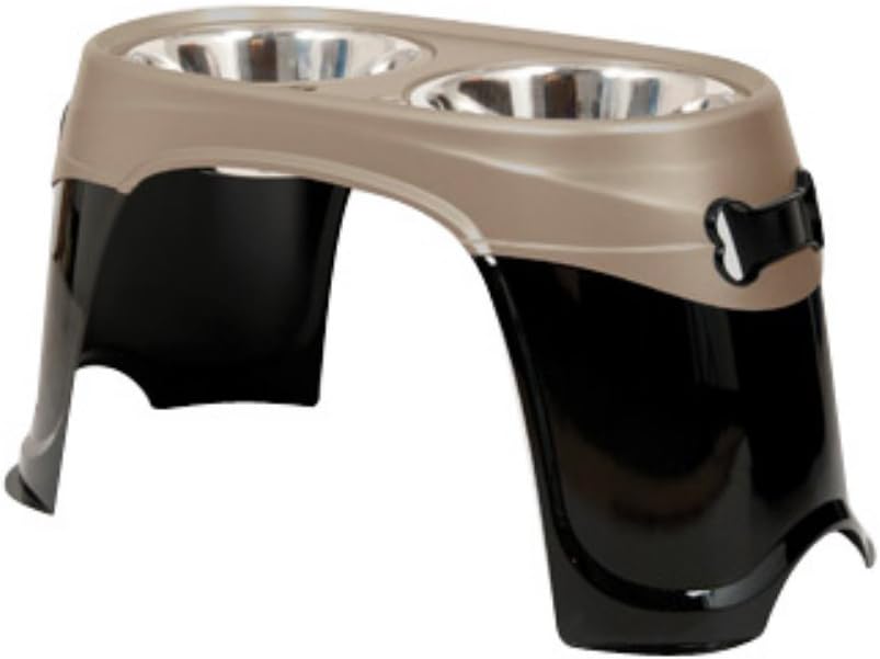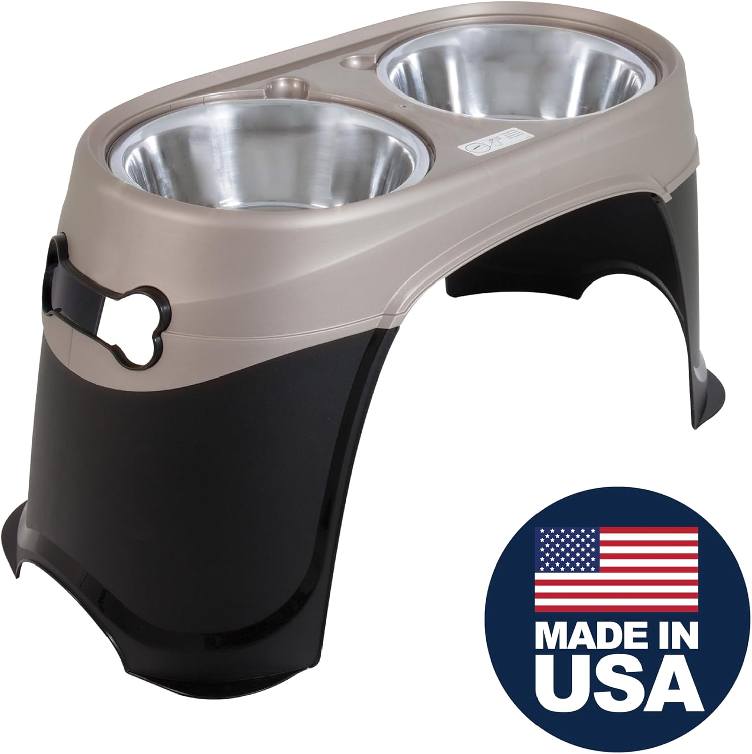 The Pet mate Easy Reach Pet Diner provides a comfortable option for pets to drink and eat without stooping. The dog feeding station keeps dog bowls elevated, allowing pets to reach their bowls without neck-strain. The tall dog bowl stand is sturdy for extended use; rubber inserts beneath each stainless steel dog bowl prevent the stand from squeaking as pet eat. The raised rims around each spill proof dog bowl prevent mess around the bottom of the dog food stand. The stainless steel bowls are removable and dishwasher safe for easy cleaning. Bone cutouts on both sides provide designated spots pet parents to easily pick up and carry the stand. The Easy Reach dog feeders are available in two sizes, including Medium and Extra Large, to accommodate a wide range of pets. "Black" and "Pearl Tan" colors allow easy placement in any room of the home.