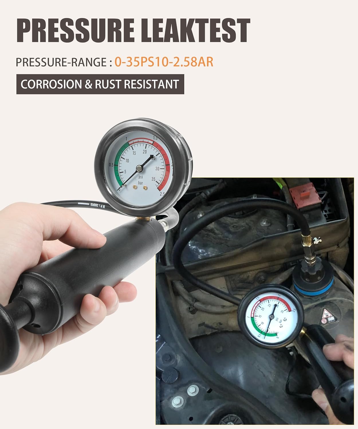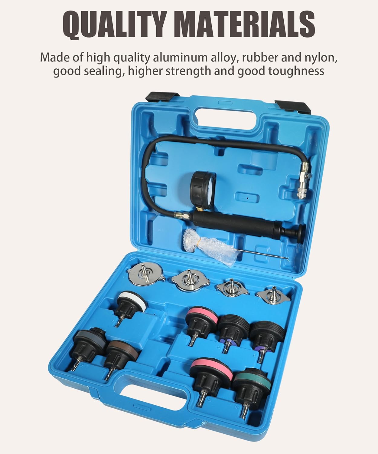 Material: aluminum alloy, rubber, and nylon What will you get in the box? -14 piece car cooling system water tank leakage detector Our product advantages: -Made of high-quality aluminum alloy, rubber, and nylon, it has better sealing performance, higher strength, and good toughness -Provide higher stability to extend service life and have better vacuum effect -Helps detect internal and external leaks. Perfect for detecting cylinder head gasket faults on which side or cylinder of the cylinder block is leaking -Blow molding tool box to keep all tools in place and avoid damage even under bumpy conditions -Suitable for cars, trucks, motorcycles, ATVs, air freight, etc