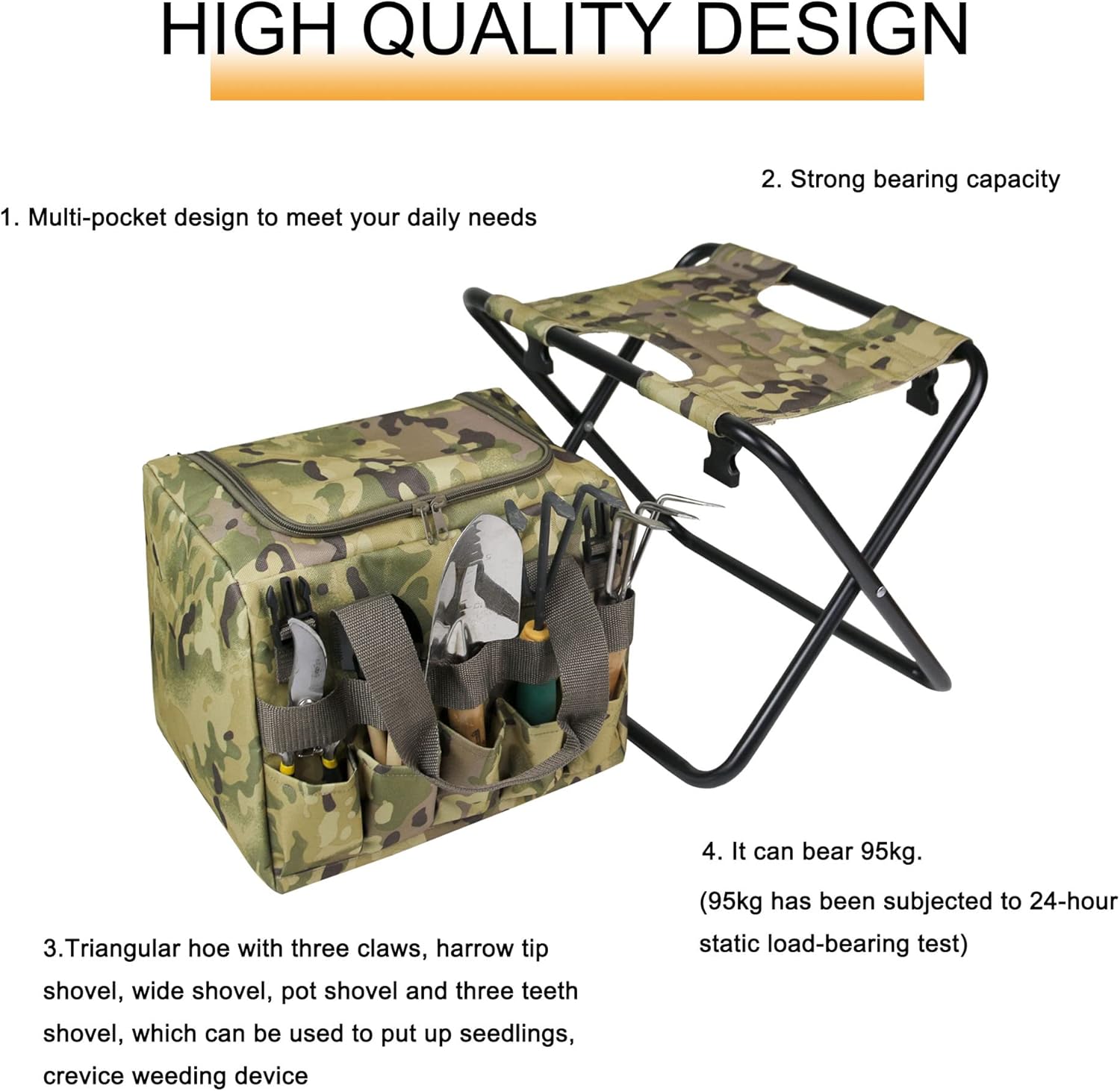 UNISTRENGH Multifunction 2 in 1 Foldable Garden Stool Portable Folding Hunting Fishing Collapsible Camping Seat with Removable Tools Handbag Storage BagProduct SpecificationMaterial: 600D oxford fabric cloth + stainless steel tube framethe support frame pipe: Dia. 0.63inch/1.6cm, pipe wall thickness 0.31inch/0.8cmColor: CP camouflageNet weight:3.3lbs/1.5kgPackage size:48*46*4cmMeasurement Dimensions:Folding size:16.5''L *15.7''W *1.57''H / 42*40*4cmUnfold size: 15.7''L *12.99''H*11.02''W / 40*33*28cmDimensional data is measured manually and subject to some within 0.39"-0.79" deviationProduct Feature:Dual zipperPadded magic haldleInner liner with waterproof coatingDetachable with quick buckleMulti pocket design for the daily use or garden workHeavy duty 600d oxford material made up to 210 pounds load bearingPackage Included:1 * stool--We focus on making customers enjoy our products at a reasonable price. After all, we are customers, too, so if you have any questions or have a wonderful idea about this Stools, you are always welcome to contact us by e-mail, we will answer you within 24 hours.
